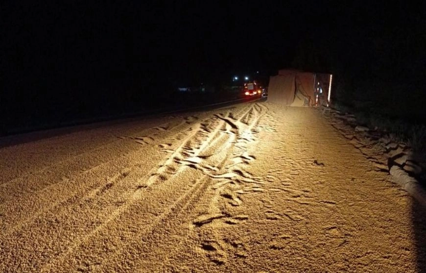 A colisão provocou o derramamento da carga de soja que era transportada por uma das carretas, que ficou espalhada sobre a rodovia, bloqueando a via e interrompendo o fluxo de caminhões que transitavam pelo trecho.